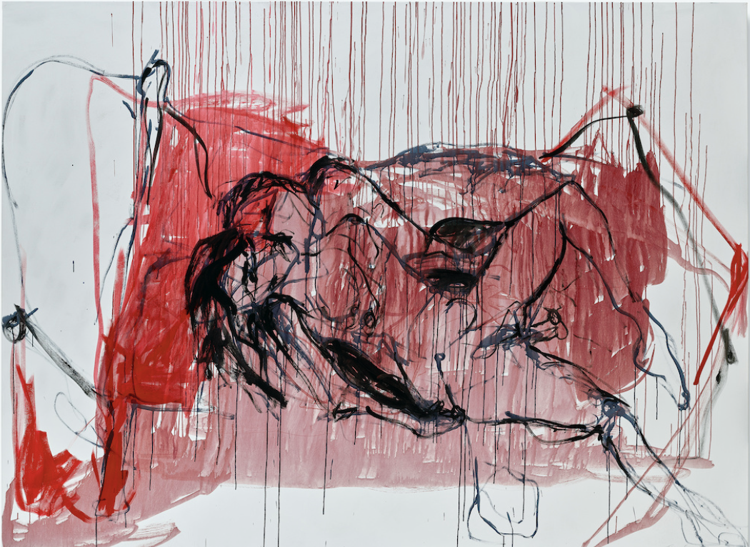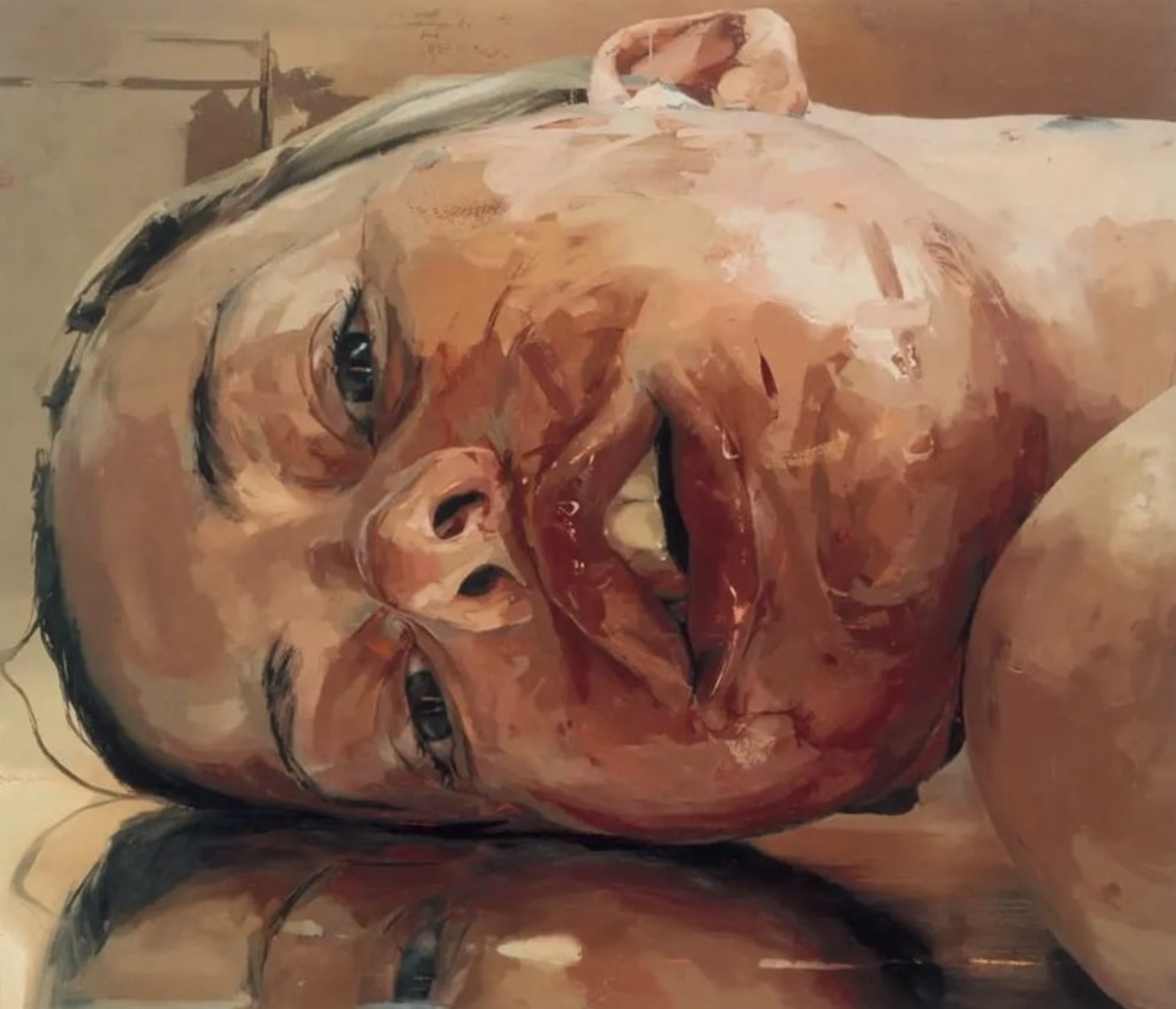 Jenny Saville operates differently: less diaristic, more bodily-epistemic. Her painting does not display the body; it investigates it—as mass, as flesh, as social inscription, as a site of violence and projection. Critical reception repeatedly emphasizes how Saville fuses figuration and abstraction: flesh becomes, simultaneously, image and painting, matter and meaning. As concrete examples that correspond stylistically with Bower—through intensity, corporeality, and painterly aggression—Saville’s Propped (1992) stands as an early manifesto of confrontation, forcing the gaze onto weight, text, and self-assertion; and Reverse (2002–03) brings the head so close that portrait and material study collapse into one another. Both function much like Bower: proximity is not an offer of intimacy, but a test.