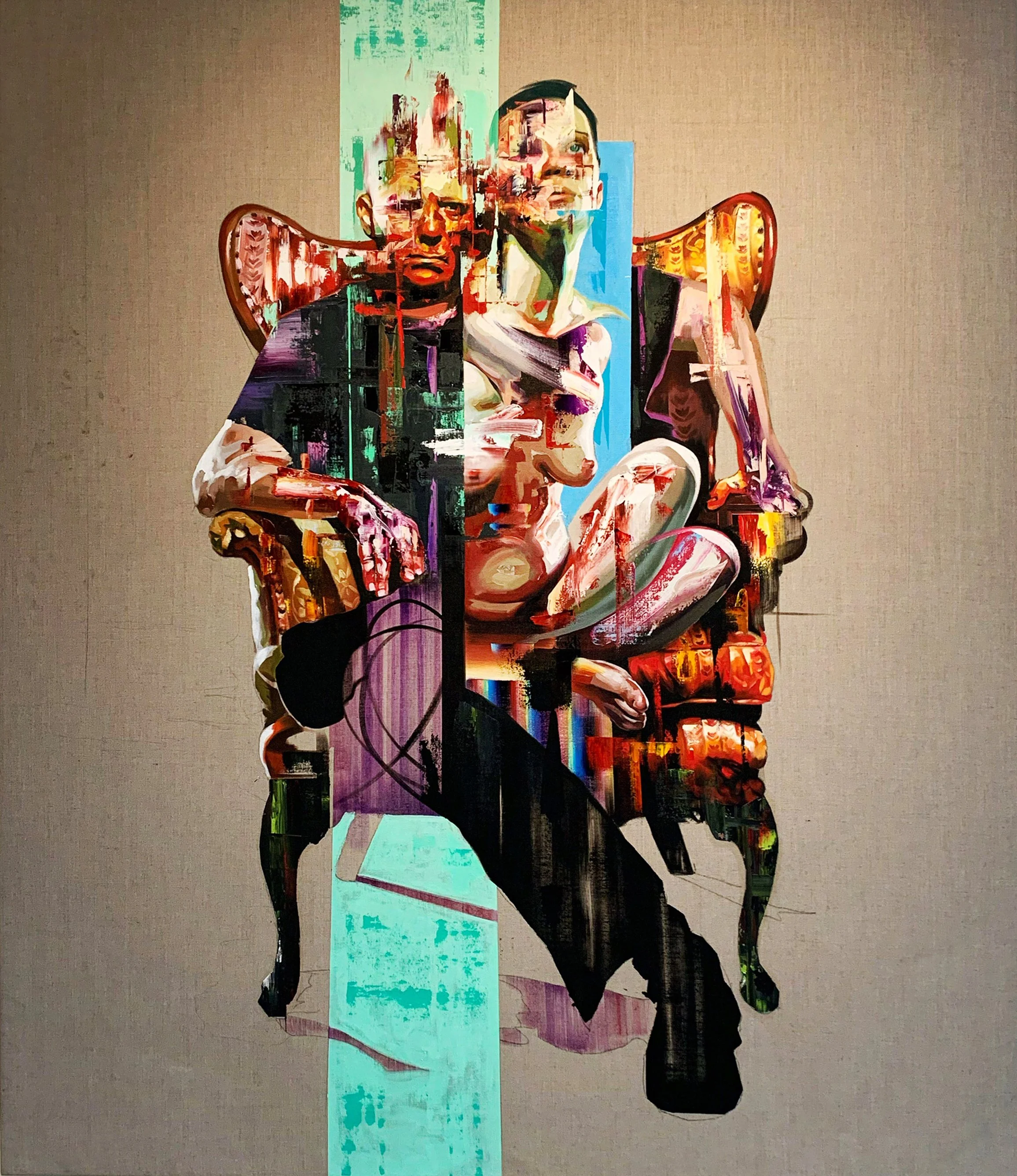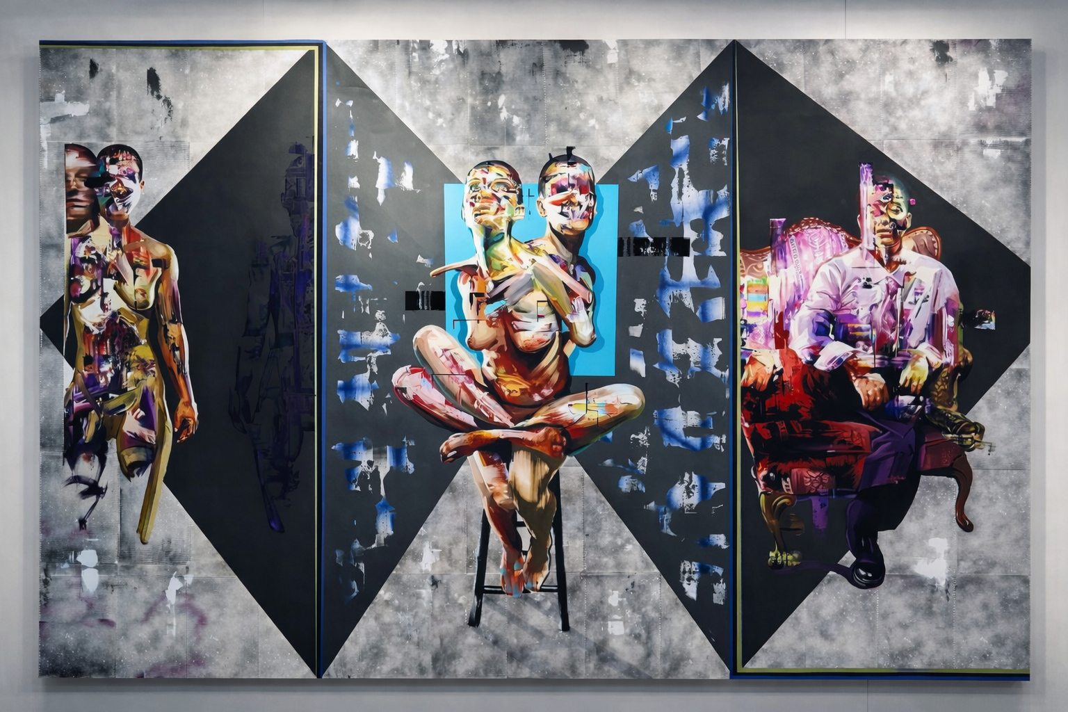 Yet this confrontation does not remain confined to the individual psyche; it expands into a kind of system-image. Bower’s pictorial world suggests that identity is often experienced today as montage—persona, avatar, social role, body as interface. Geometries, hard planes, and incisions operate like a visual grammar of the present, in which the subject appears not as essence but as a continually re-rendered surface. At the same time, the figure condenses collage-like into an overpressure of body, space, and time: too many layers, too many narratives, too many signals that refuse to settle. This is where the work aligns with the larger Bacon/Freud line—not through formal resemblance, but through stance: reinstating the figure as a site of existential demand, a testing ground of psychic truth that cannot be “pleasantly looked at” without pulling us in.